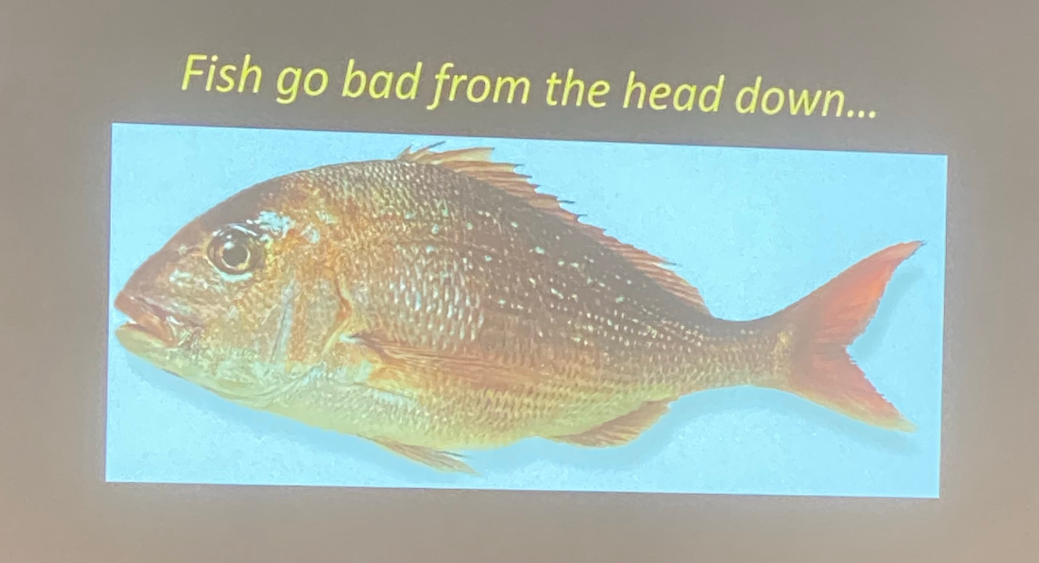 Again, in a volatile, uncertain, complex and ambigious world, the skill of oral communication and putting your point across to a diverse audience with varied values is the top fushion skill. All of her list of 12 fushion skills are very important to suppoort any technical skill project leaders possess. She concluded her keynote by saying that all of those fushion skills can be picked up and should be assessed for the leaders of any project / organisation, urging all project managers not to take on project work before assessing whether the leaders of that organisation lives by such skills or not. She put on the pic of the fish shared above (bad fish) stating: to know if a fish is bad, you smell it from its mouth not from its tail.