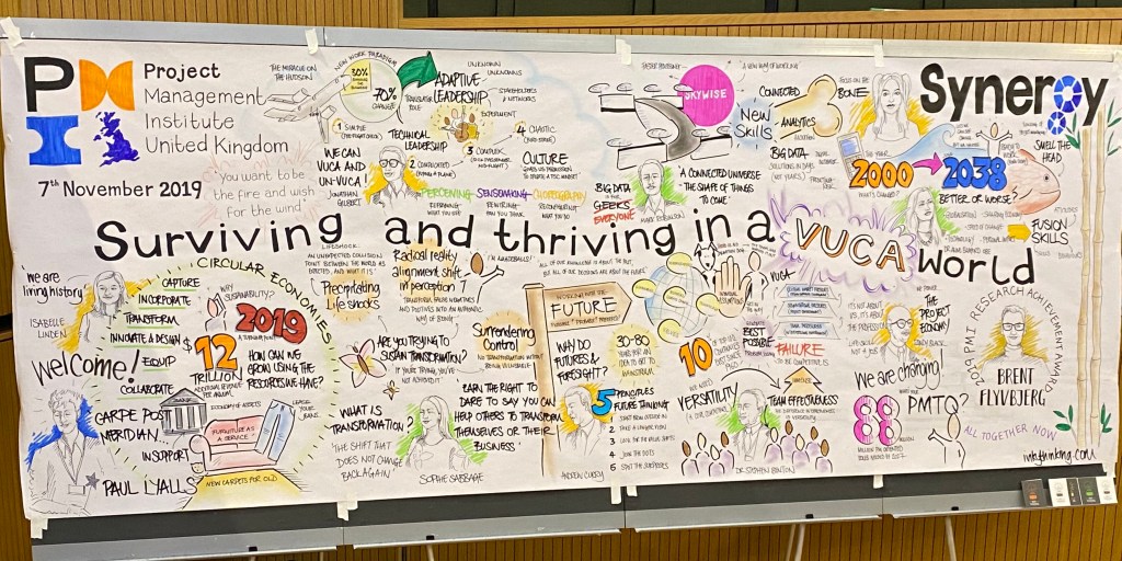 Jonathan moved on to explain how successful project managers should understand that there are four operating contexts: Simple, Complicated, Complex and Chaotic. He ran a quick survery in the room asking how many of the project managers in the room operated in each of the four contexts and none of the attendees operated in a simple context (there was over 100 attendants). Understanding how to operate in an ever evolving complex and chaotic context, project managers must develop their ability to ‘PSC’ – Perceive, Sense make and choreograph (referenced in my screen shot above Leading in Context, 2019). Jonathan applied his PSC model on the pilot Sully Sullenberger who succussfully landed an airbus in NYC freezing Hudenson where all 155 passengers survived. You can find out more about the story known as ‘Miracle on the Hudson’. Jonathan’s session was (in my opinion) a great session to start the day and set the tone of the importance of leadership skills in a VUCA environment.