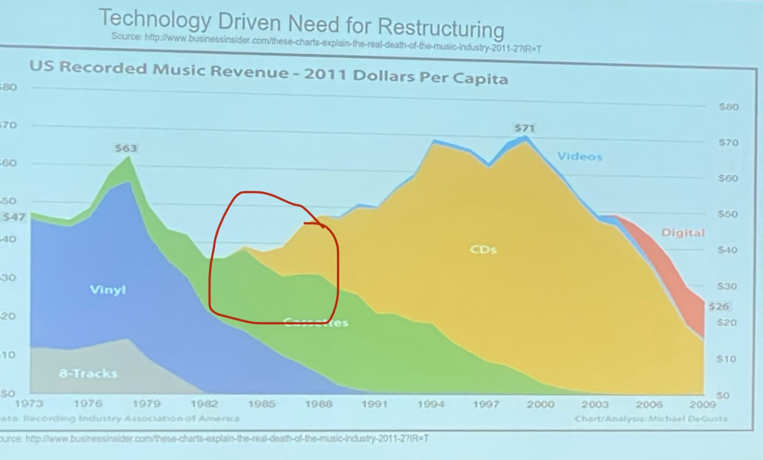 Dr Benton is the first UK professor on Business Psychology. He took us through a journey on how decisions are made and how versatility is another competency today’s leaders should be equipped with. Versatility comes with combining the the skills to gather, process and communicate information. Cause and effect is no longer a linear process. In today’s VUCA world, the process is much more complex like solving a puzzle. The image highlighted above (case study on the evolution of music industry) is an example of how VUCA world operates. the area highlighted in red is the VUCA world in the context of casettes. Casettes sales have been facing a drop across the years but wittnessed a surge in 1985 before continous dip across the year. Making a decision to stick or drop casette production in 1985 is a way to demonstrate the VUCA world we live in; except today it happens more rapidly.