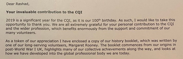 Vince Desmond, CEO of the CQI, has signed a letter of appreciation attaching a book: The History of the CQI. What a fantastic gift to receive.