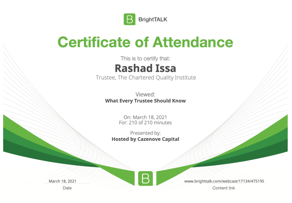 When the opportunity came up last year to join the Chartered Quality Institute Board of Trustees, I was excited and nervous at the same time. Everything I know or familiar with all of a sudden appeared to be so little compared to what is expected from a Trustee. So the journey of exploring, understanding and educating myself began.