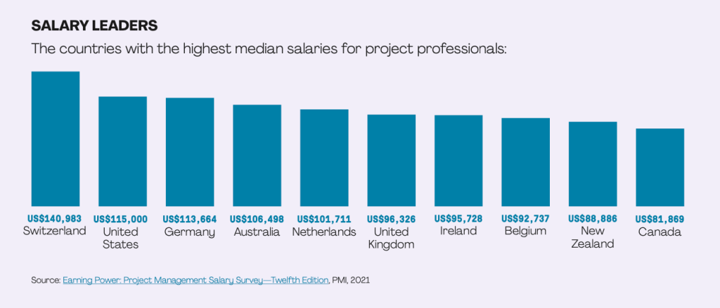 3. Countries with high Salaries: While the Middle East and African sub Sahara are showing most opportunity for growth, none of the countries in those regions are amongst the top 10 paying countries for Project Professional salaries. I dispose each economy will go through its own cycle of learning to understand the positive impact such professionals have on growth.