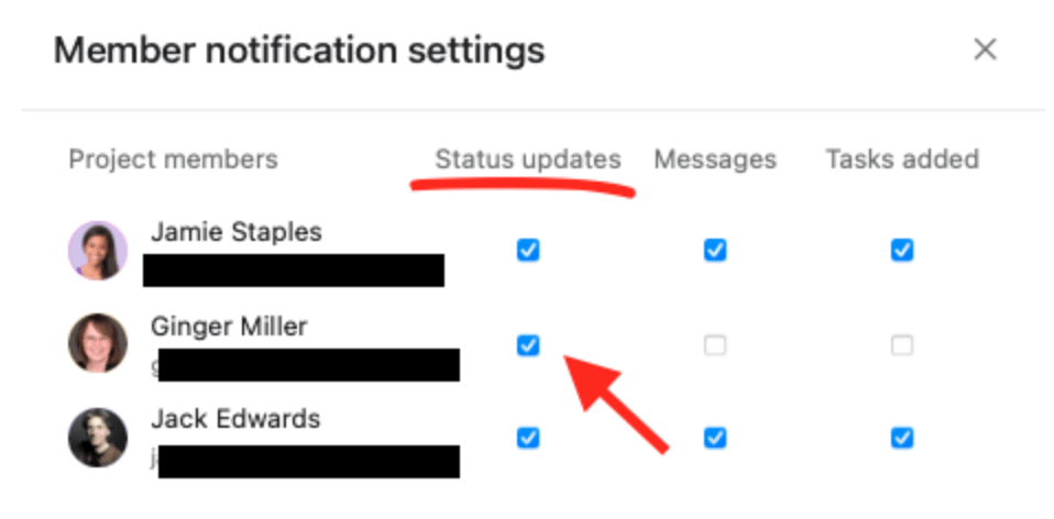 if your stakeholders are only interested in being informed, make sure you go to project permissions and notifications and untick all types of notifications for these stakeholders except for status updates. In the example below, Ginger is a stakeholder who only needs to be informed of the status update.